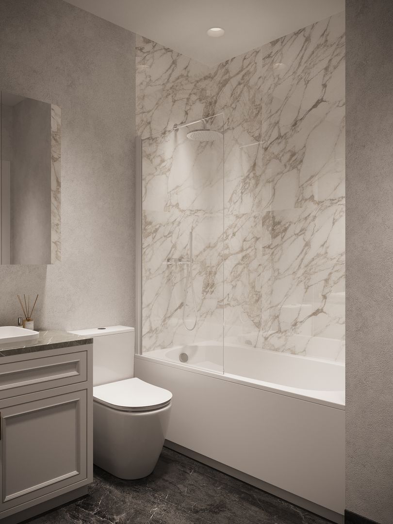 • Modern Bathrooms: The primary bathroom includes a walk-in shower, while the second bathroom offers a full-size tub and shower. Both bathrooms boast white Calcutta porcelain tiles with grey veining and Delta Faucet products.